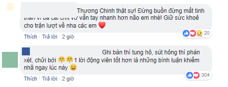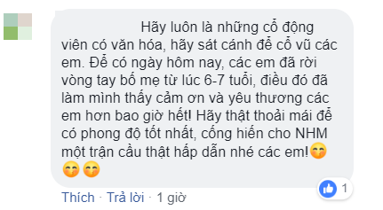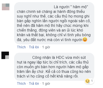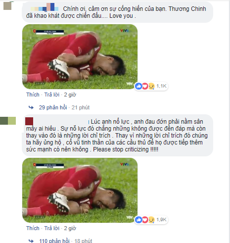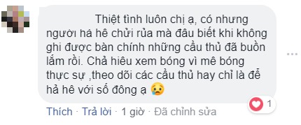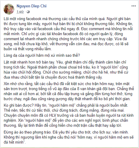 "Lội một vòng facebook mà thương các cầu thủ của mình quá. Người ghi bàn thì được tung lên mây, người hụt bàn thì bị chửi không thương tiếc. Không tin, thử truy cập vào vài facebook cầu thủ ngay đi. Đọc comment mà không tin nổi mắt mình. Chỉ ước gì các tài khoản facebook đó có người quản lý, đóng comment lại nhanh nhanh chóng chóng trước khi các em truy cập. Vừa đá xong, mồ hôi chưa kịp khô, vết thương vẫn còn đau, mà đọc được, có lẽ sẽ buồn và thất vọng nhiều lắm.