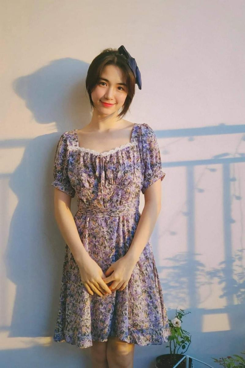 Chiếc váy hoa nhí rớt vai màu xanh mát mắt khiến hội chị em “săn lùng” giúp nữ ca sĩ khoe được bờ vai thon và xương quai xanh đáng ngưỡng mộ. Phụ kiện “hồi teen” yêu thích của cô nàng chính là những chiếc nơ to bản với màu sắc nổi bật.