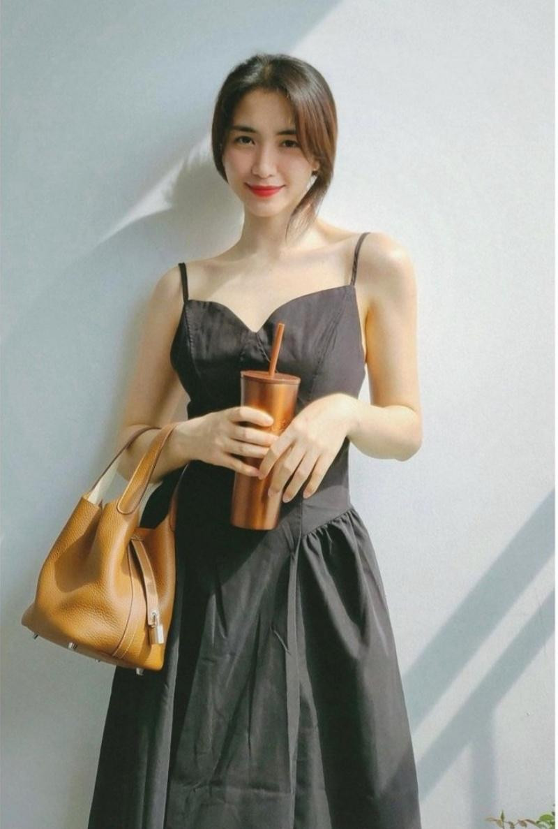 Váy hai dây màu đen cơ bản mix cùng túi xách da đơn giản mà vẫn thời trang.