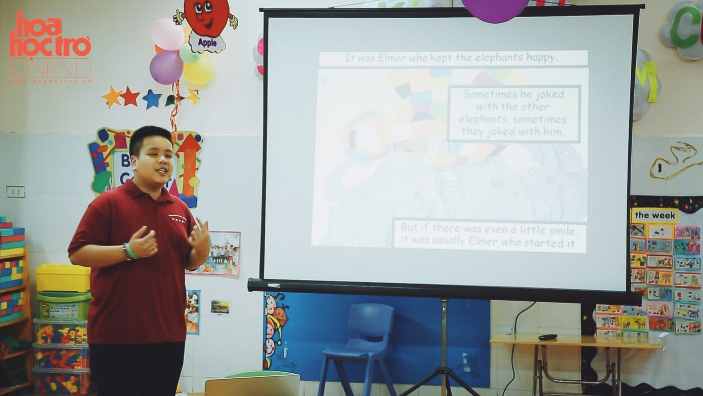 Đỗ Nhật Nam chia sẻ với các em về câu chuyện "Chú Voi Elmer", một chú voi được yêu quý vì những điều khác biệt và khuyến khích các em hãy phát huy trí tưởng tượng của mình.