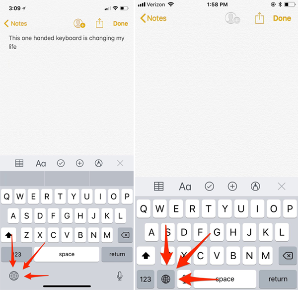 Hãy tìm biểu tượng quả địa cầu ở góc dưới bên trái màn hình. (Hình bên trái là giao diện bàn phím trên iPhone X, bên phải là giao diện bàn phím trên iPhone đời cũ hơn).