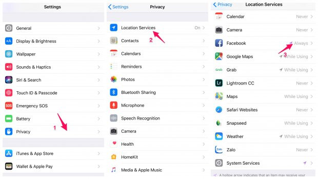 Bước 1: Đầu tiên bạn hãy kích hoạt chức năng định vị trong cài đặt bằng cách vào Settings > Privacy > Location Services > Facebook > Ấn chọn “Always”.