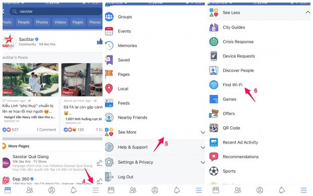 Bước 2: Tiếp đến bạn hãy truy cập vào ứng dụng Facebook trên điện thoại. Sau đó ấn chọn vào biểu tượng 3 gạch để sử dụng các tính năng mở rộng, tiếp tục chọn “See More” để xem danh sách các tính năng và chọn “Find Wi-Fi”.