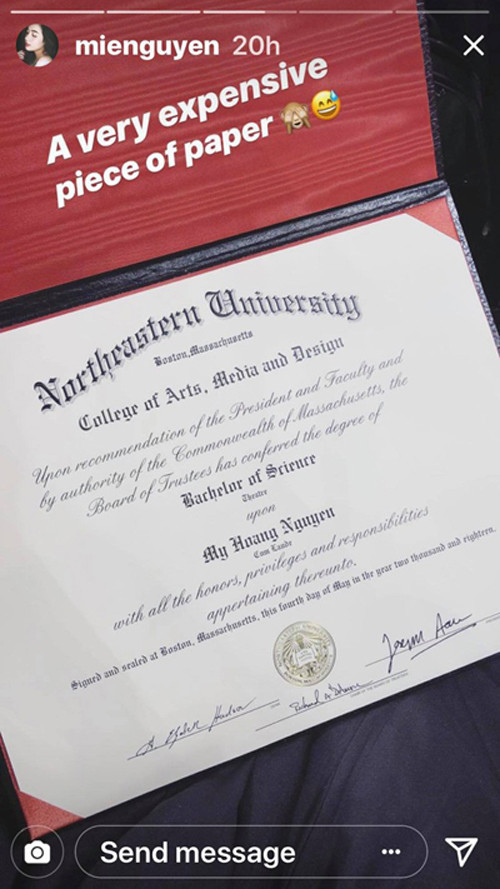 Mới đây, trên Instagram, Mie hào hứng khoe nhiều hình ảnh khẳng định rằng cô đã tốt nghiệp đại học. Thực tế, Mie Nguyễn có thể tốt nghiệp vào năm ngoái. Tuy nhiên, cô đã lựa chọn việc đi làm một kỳ rồi mới học tiếp.