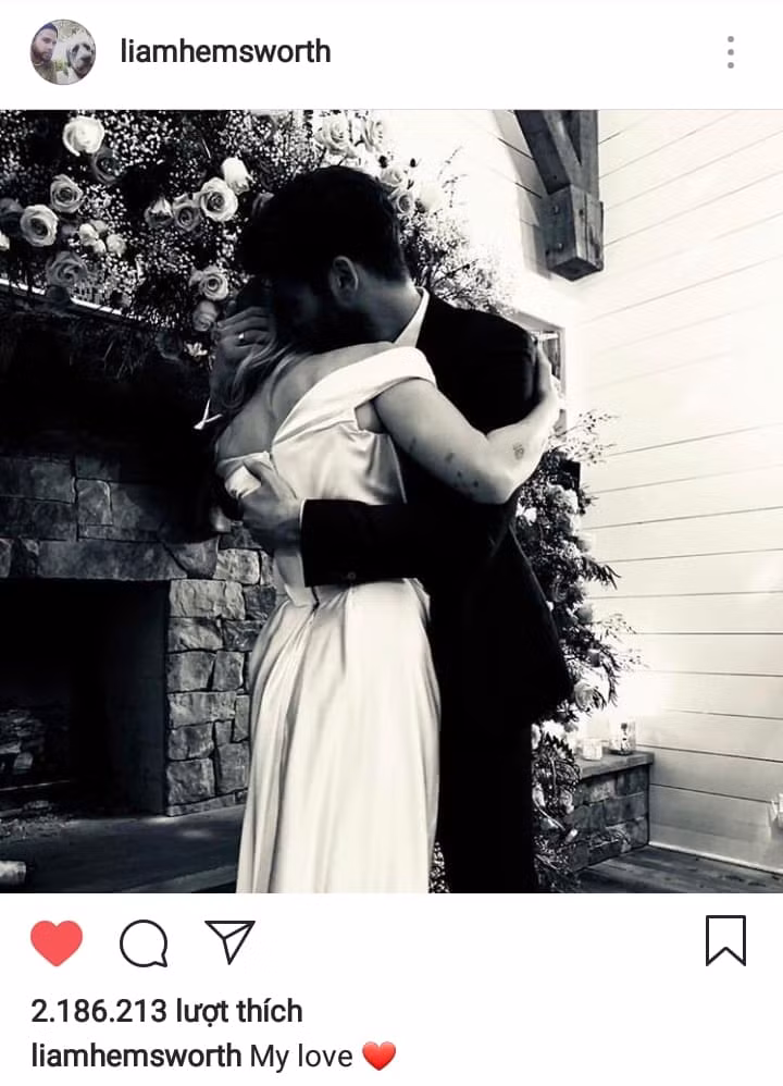 Chỉ cách đây vài giờ, Miley Cyrus đã chia sẻ 3 bức ảnh trắng đen trên Instagram, khoe khoảnh khắc lãng mạn của cô cùng Liam Hemsworth trong bộ trang phục thường thấy của cô dâu, chú rể. Và ngay sau đó, cậu út nhà Hemsworth cũng đã đăng tải một bức ảnh cặp đôi ôm nhau đầy thân mật cùng dòng trạng thái “ngọt như mía lùi”: Tình yêu của tôi.