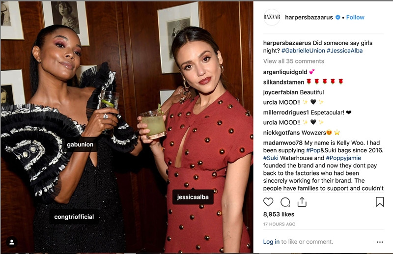 Màn đọ sắc trên thảm đỏ sự kiện giữa Gabrielle Union và Jessica Alba đã được trang Harper’s BAZAAR Mỹ đưa tin trên Instagram để khen ngợi.