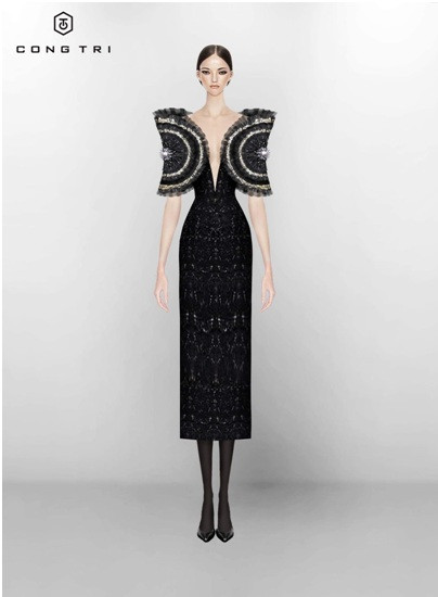 Chất liệu của bộ váy làm từ vải tweed, phần cầu vai được đính hết khá cầu kỳ theo dạng hình học kết hợp với lông vũ tạo nên sự hài hoà giữa sắc đen trắng. Phần thân được đính trên nền vải tweed bởi hành nghìn viên đá Swarovski.