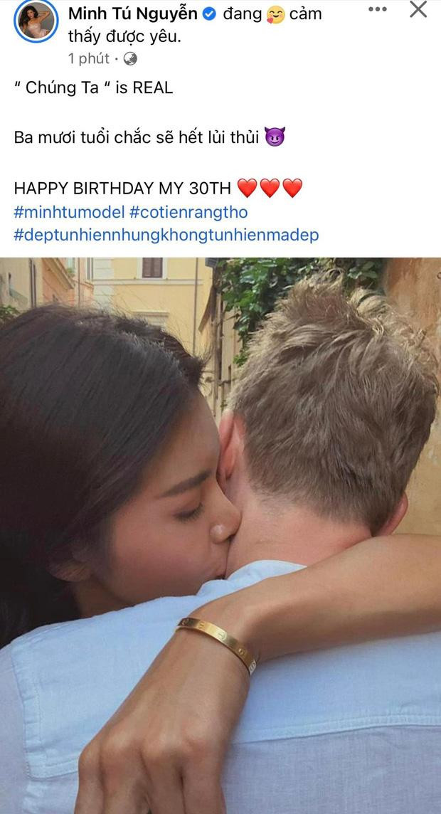 Cách đây không lâu, dân tình được phen ngỡ ngàng khi Minh Tú chia sẻ một tấm ảnh hạnh phúc bên một người đàn ông giấu mặt vào đúng dịp sinh nhật. Với dòng trạng thái "'Chúng ta' is real. Ba mươi tuổi chắc sẽ hết lủi thủi. Cảm thấy được yêu", Minh Tú chính thức xác nhận rời hội "độc thân vui tính". Netizen không khỏi "đoán già đoán non" về danh tính người yêu của siêu mẫu, thế nhưng đến hiện tại, Minh Tú vẫn không bật mí thêm.