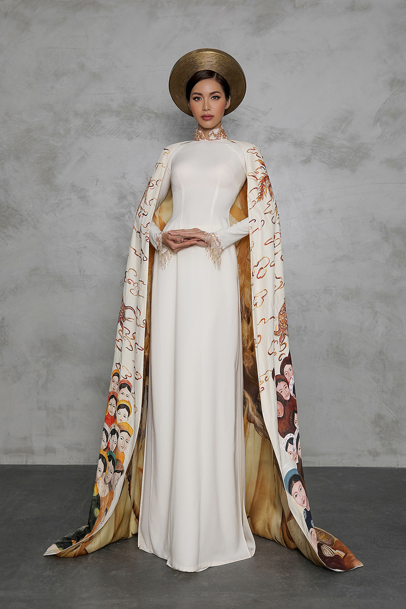 Bộ áo dài này gồm hai phần, là áo dài cổ cao, dáng truyền thống cùng phần áo choàng bên ngoài được làm tỉ mỉ, chất liệu lụa, đính kết nhẹ nhàng bởi những viên đá (đá Agte và đá Opal) không quá lấp lánh nhưng khá tinh tế.