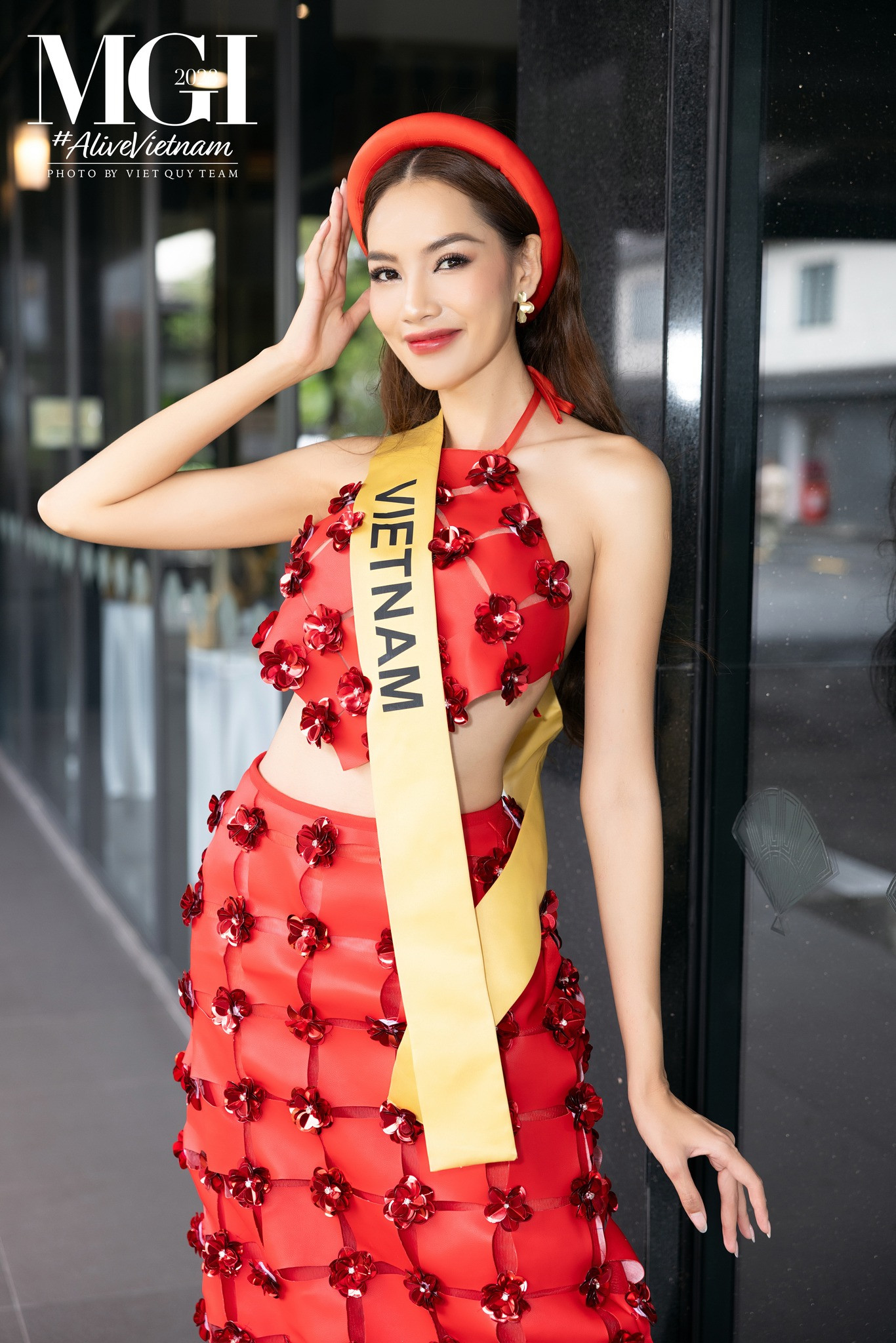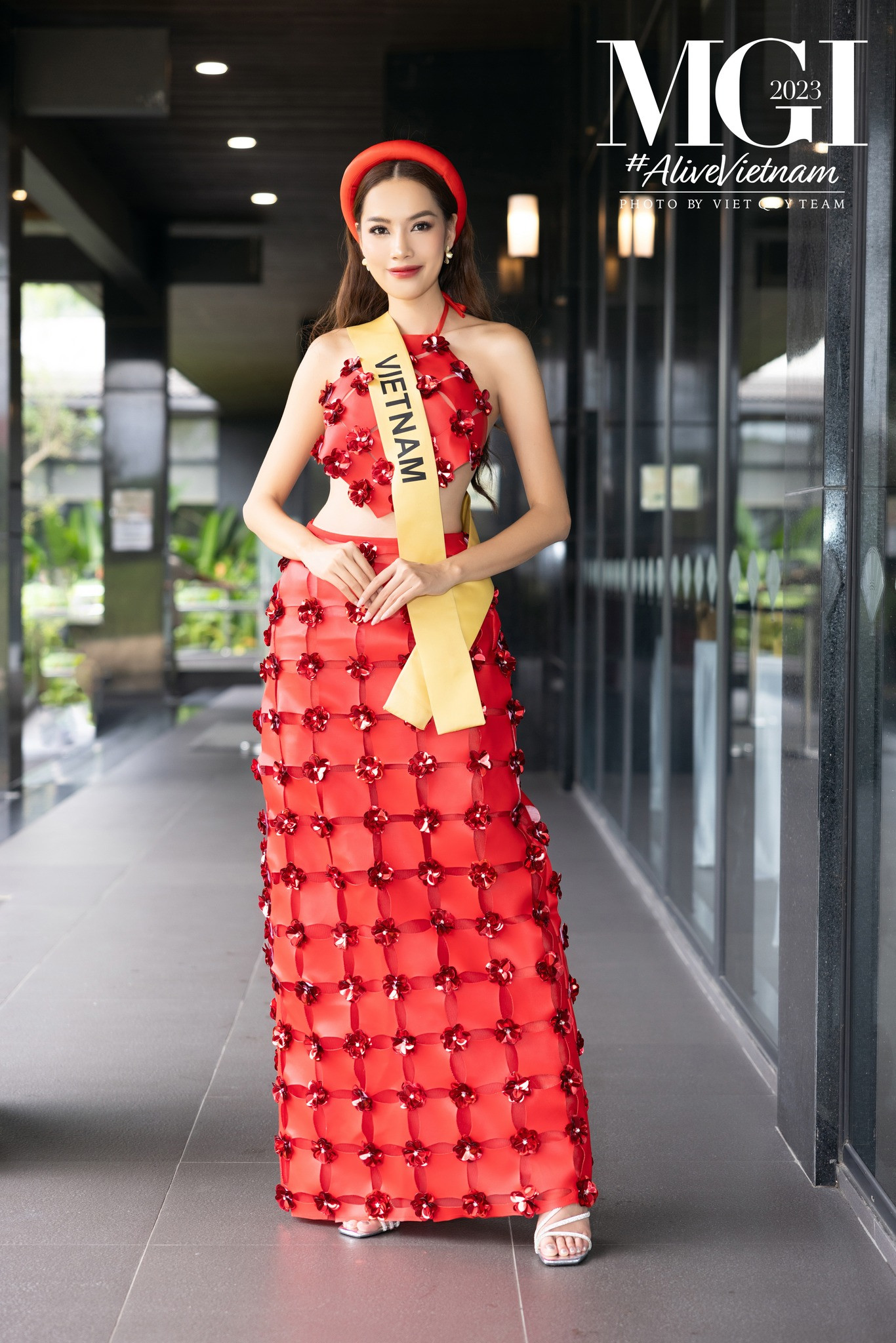 Hoa hậu Lê Hoàng Phương tiếp tục chọn thiết kế màu đỏ mang ý nghĩa đặc biệt. Bộ trang phục được lấy cảm hứng từ trang phục truyền thống Bắc Bộ: Áo yếm kết hợp với các hoạ tiết thị giác hình học trong kiến trúc, cũng là công việc và đam mê hiện tại của Phương.