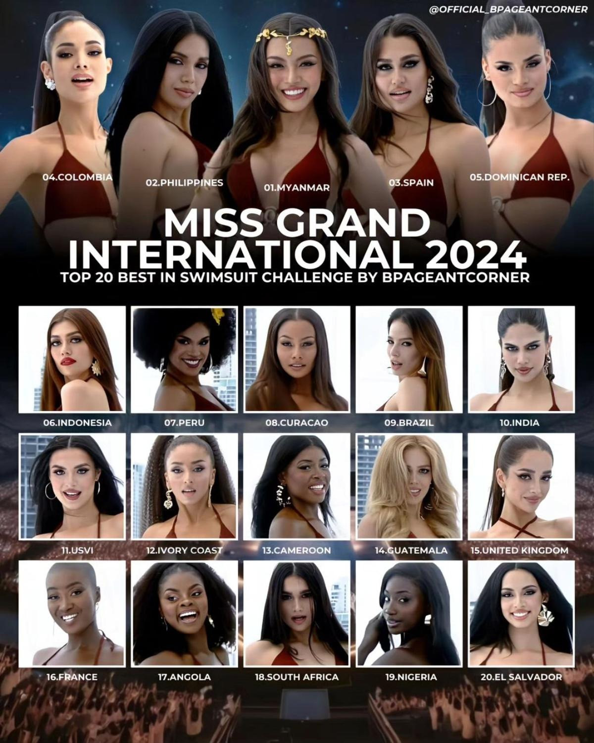 Chuyên trang nhan sắc B Pageant đưa ra danh sách 20 thí sinh trình diễn bikini xuất sắc nhất. Không ngoài dự đoán, Miss Grand Myanmar vẫn đứng đầu bảng nhờ thần thái cuốn hút, vóc dáng chuẩn chỉnh và kỹ năng catwalk cực kỳ tự tin.