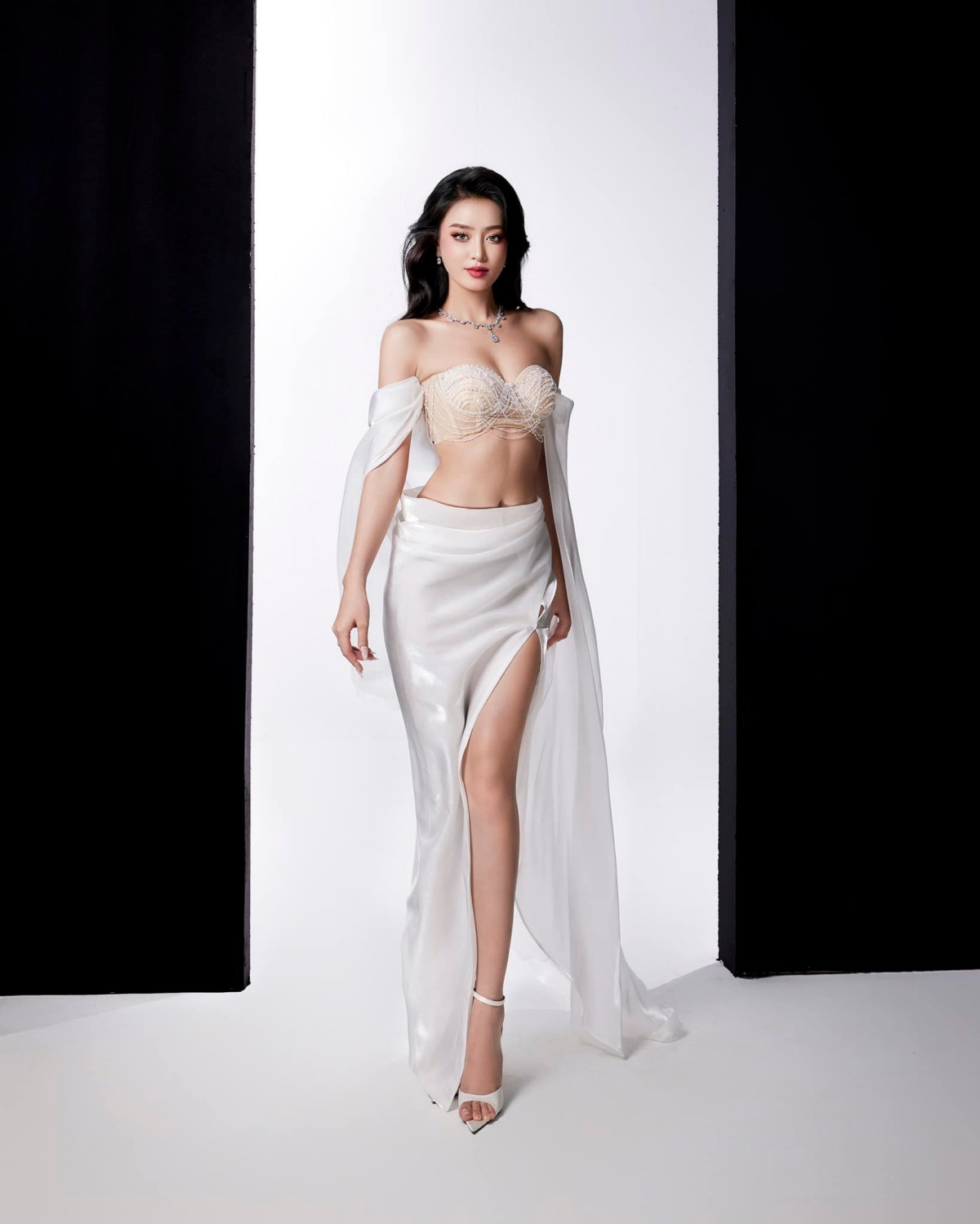 Tham gia Miss Intercontinental 2024, Bùi Khánh Linh thường xuyên chọn các thiết kế để khoe triệt để lợi thế này.