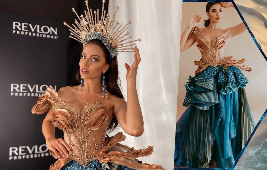 Trang phục dân tộc tuyệt đẹp của Hoa hậu Namibia tại Miss Supranational 2021, thiết kế đính đá cầu kỳ mang đậm dấu ấn của người Namibia, được lấy cảm hứng từ "hai lực lượng cân bằng" của quốc gia này là sa mạc và đại dương.