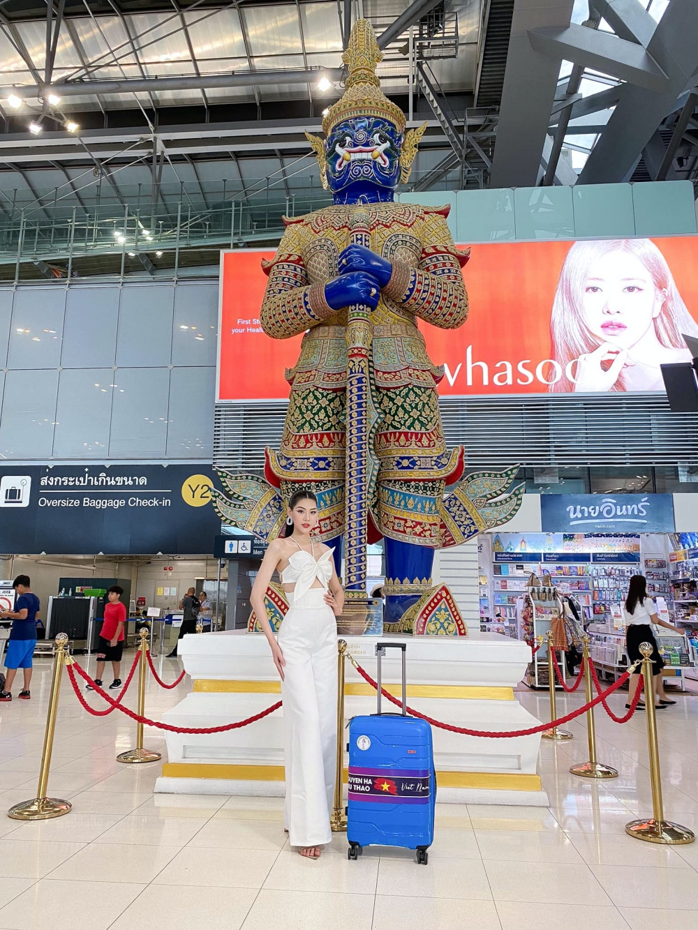 Dịu Thảo nổi bật tại sân bay quốc tế Suvarnabhumi, Bangkok.