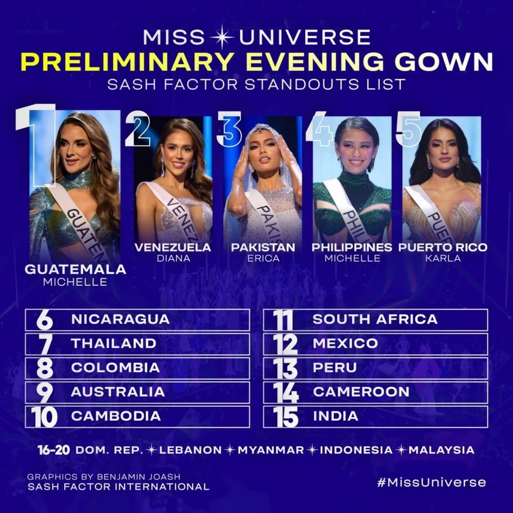 Bên cạnh những gương mặt quen thuộc, Top 10 thí sinh trình diễn trang phục dạ hội xuất sắc nhất đêm Bán kết Miss Universe 2023 theo đánh giá của Sash Factor xuất hiện những cái tên khá bất ngờ.