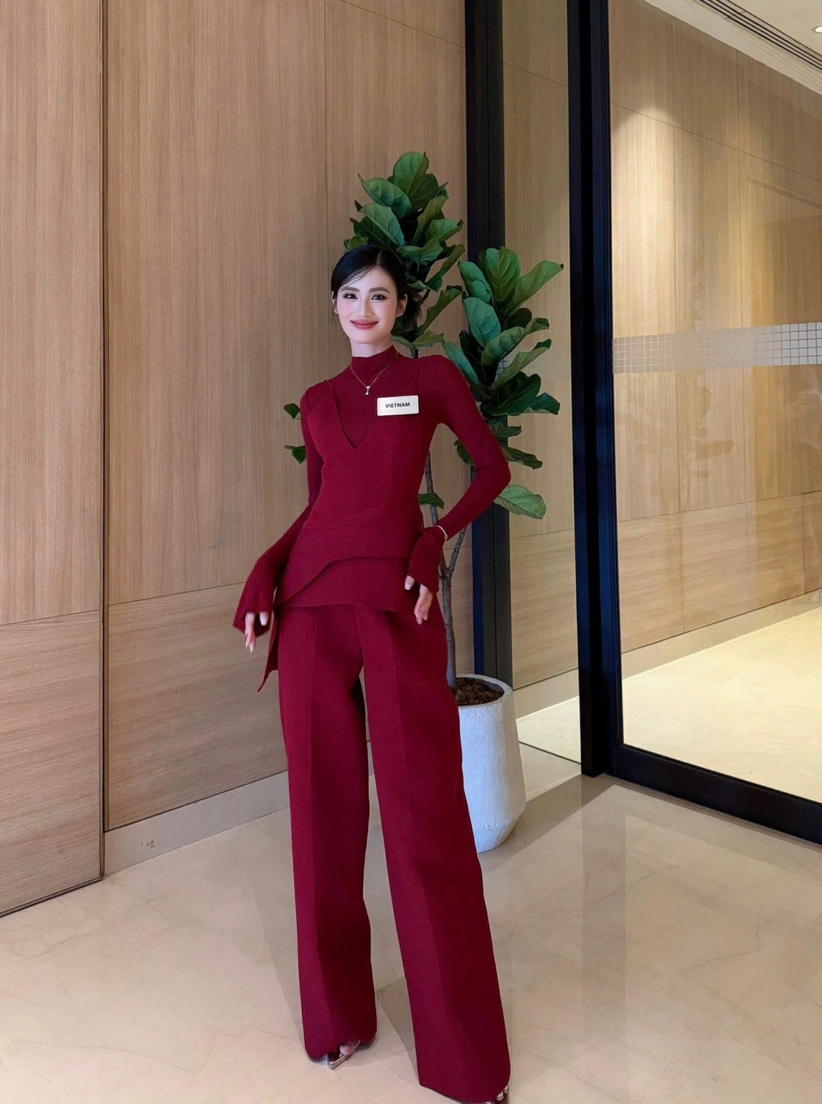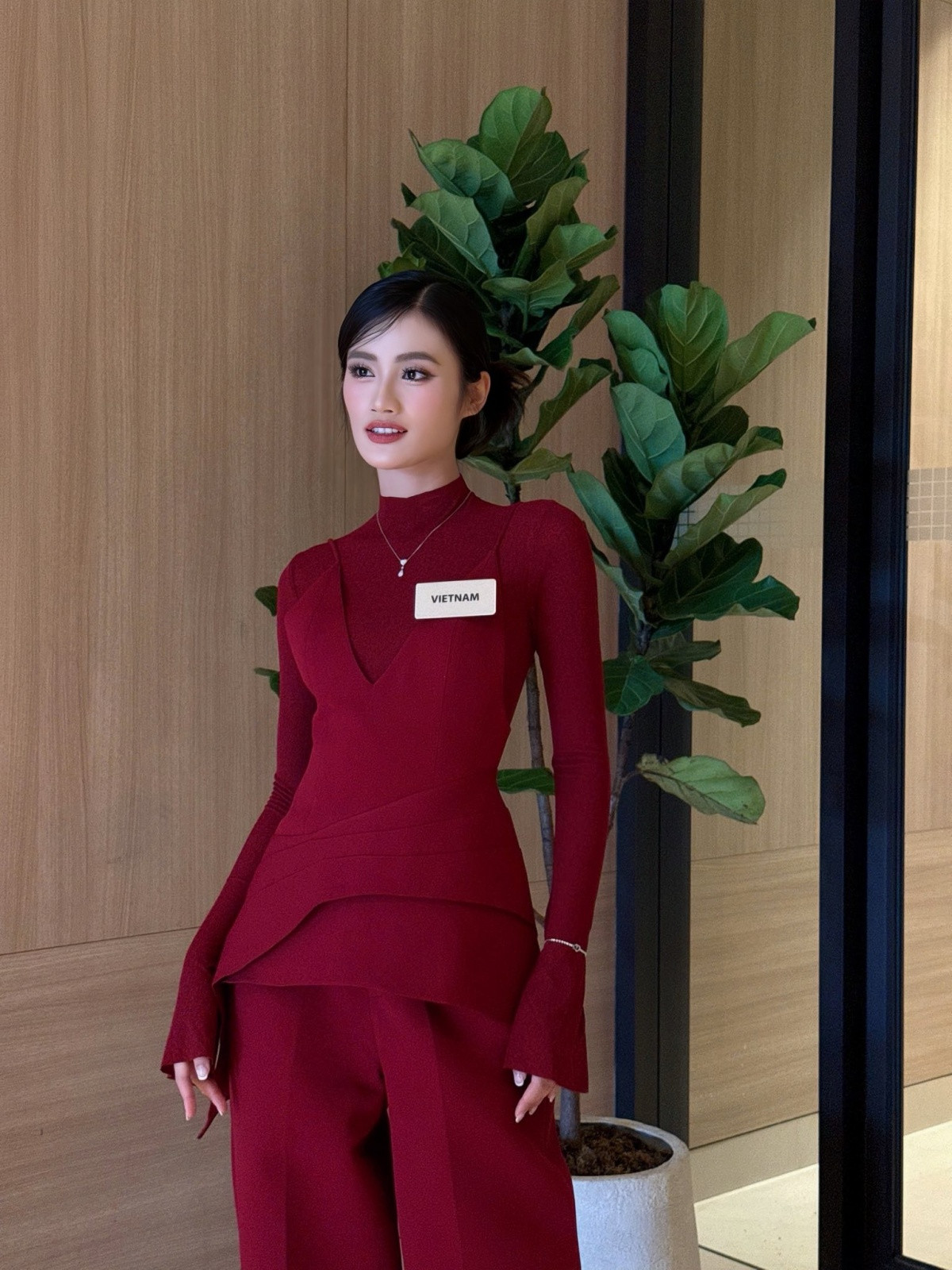 Ở ngày thứ 17 của Miss World 2025, Ý Nhi mặc set đồ màu đỏ đậm, cổ vũ cho các thí sinh vào vòng Chung kết Head 2 Head Challenge.