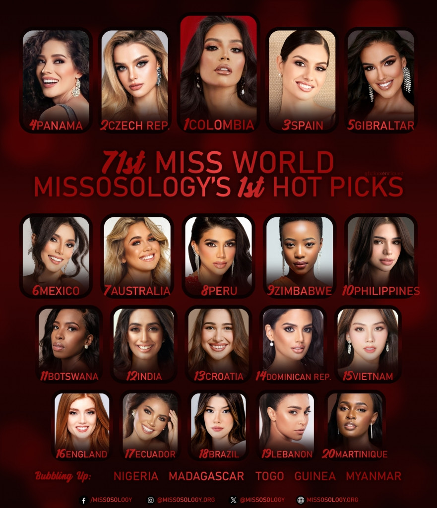 Chuyên trang nhan sắc quốc tế Missosology đưa ra BXH dự đoán lần đầu về Miss World lần thứ 71 khá muộn, khi mà cuộc thi đã sắp đi được một nửa chặng đường. Lý do cho việc này được giải thích là vì Miss World vốn không phải là một cuộc thi thuần về nhan sắc, nên không phải chỉ cần ngắm nhìn sắc vóc của các thí sinh để dự đoán.