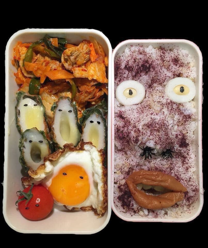 Một trong số những tác phẩm kinh dị đó là tạo hình mặt quỷ và cái mắt mở to, lưỡi thè ra, cùng đôi bàn tay nhăn nhó. Trong số đó, ám ảnh nhất là những hộp cơm tạo hình ngón tay bị đứt hoàn toàn khỏi bàn tay được tạo thành từ xúc xích và nước sốt.