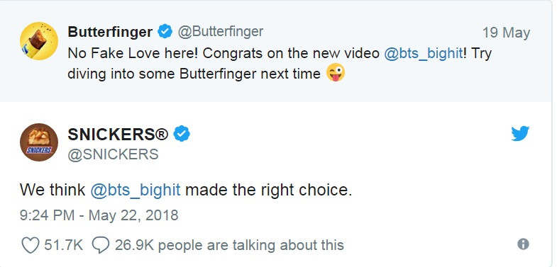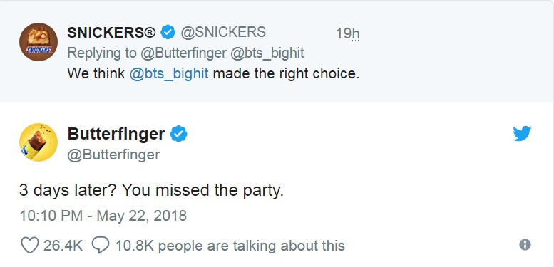 Vậy là đủ để khẩu chiến nổ ra giữa Butterfinger và Snickers, khi hai địch thủ không ngừng châm chọc nhau. Butterfinger chế giễu Snickers chậm chân, MV tung ra tới ba ngày mới thèm cảm ơn BTS. Còn các fan thì hết sức hào hứng theo dõi cuộc khẩu chiến này.
