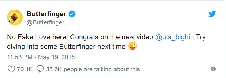 Ngay sau khi Fake Love lên sóng, nhãn hiệu Butterfinger đã nhanh tay đưa tin về MV này trên Twitter, kèm theo lời cám ơn BTS và hy vọng lần sau, các chàng trai sẽ tiếp tục ủng hộ kẹo Butterfinger.