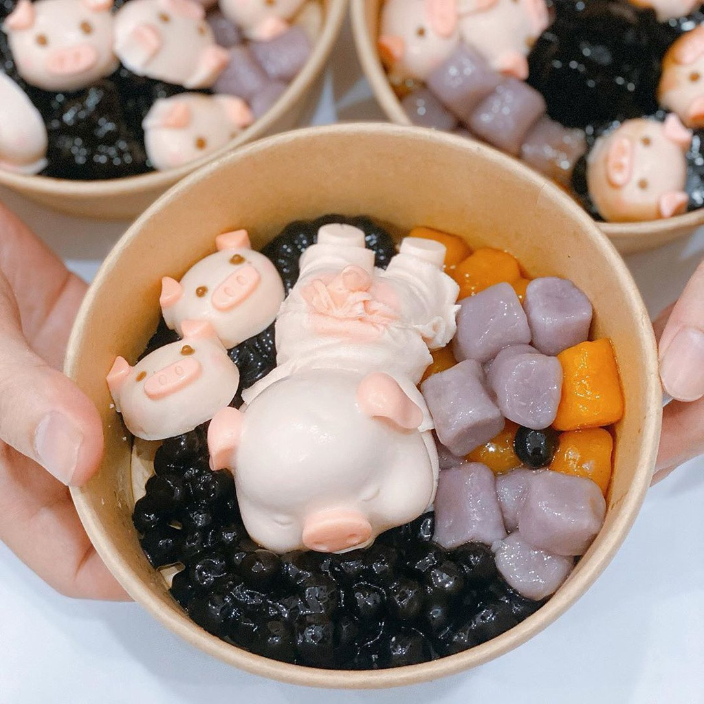 Mới đây ở phía Nam giới trẻ check in ầm ầm những bát chè khoai dẻo có thêm sự xuất hiện của một nhân vật đặc biệt - heo con. Chỉ điểm thêm một vài chú heo trắng pha hồng trên bát chè mà trông hấp dẫn hơn hẳn. Mỗi phần chè đầy đủ sẽ bao gồm các nguyên liệu như khoai lang, trân châu, sương sáo và những viên thạch dẻo hình heo con. Khi thưởng thức, thực khách sẽ rưới đều phần sốt sữa tươi lên các nguyên liệu trên sau đó cho thêm đá lạnh nếu thích. Những viên thạch hình heo con khá dẻo và mềm, có vị không quá ngọt, khi ăn cùng sốt sữa sẽ rất phù hợp.