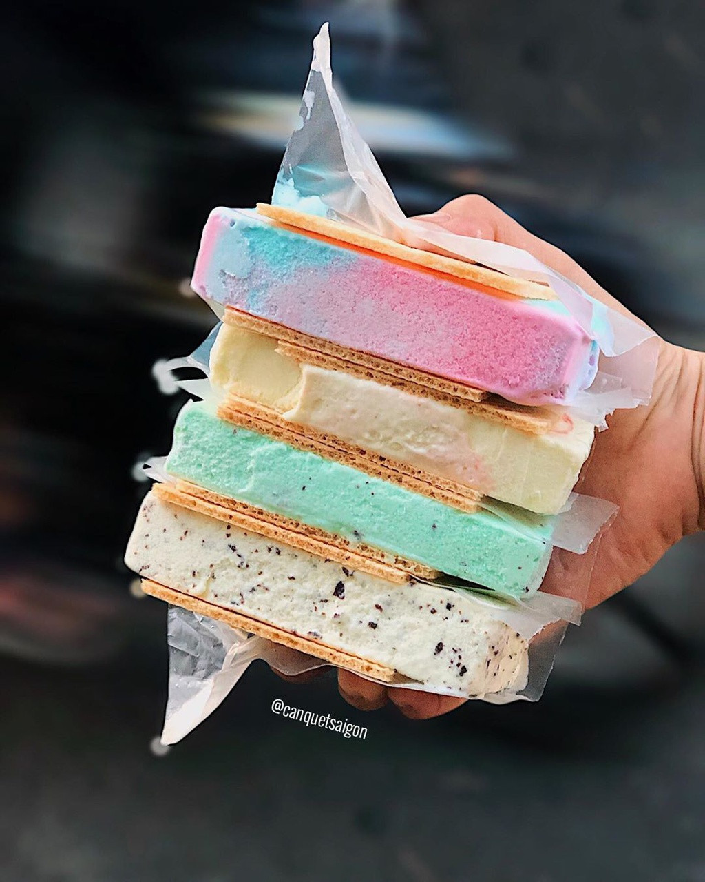 Khách đến quán sẽ chọn món kem ưa thích của mình qua 2 bước: Chọn bánh và chọn kem. Phần vỏ bánh sẽ có 2 kiểu cho bạn lựa chọn. Nếu thích hương vị giòn, xốp một chút thì bạn nên chọn bánh kẹp. Nhưng nếu bạn muốn thưởng thức lớp bánh mềm mịn, có màu sắc bắt mắt thì có thể chọn sandwich 7 màu để ăn cùng với kem lạnh.