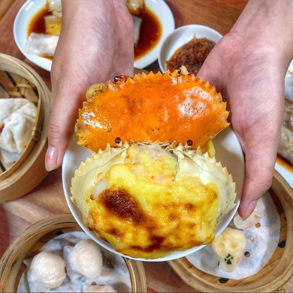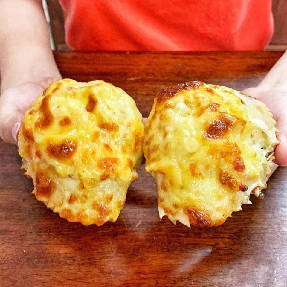 Điểm nhấn của món này không chỉ nằm ở nguyên liệu mà còn là cách kết hợp độc đáo giữa thịt cua, gạch cua cùng lớp nhân đầy ắp bao gồm sò điệp, tôm, thịt và phô mai phủ lên trên chiếc mai cua tạo hình dạng bắt mắt.