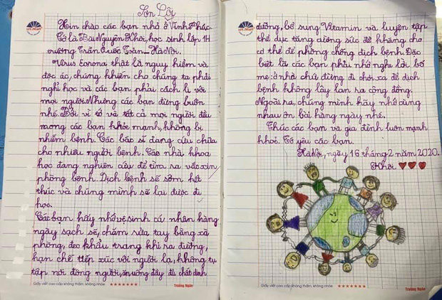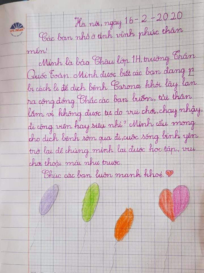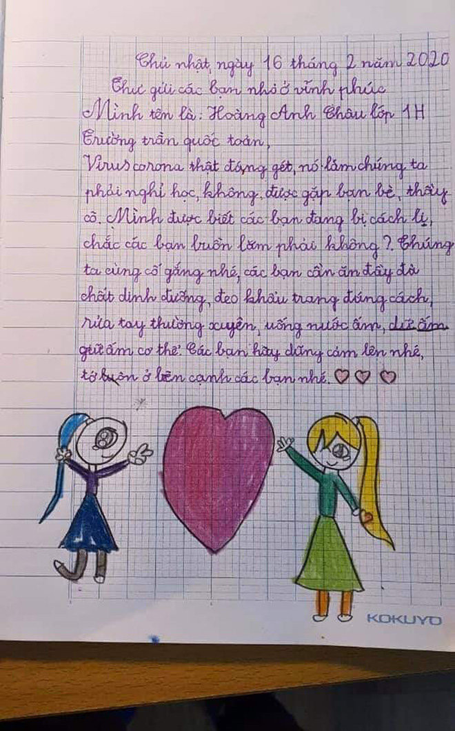 Được biết, trong khoảng thời gian học trò vẫn đang nghỉ học, cô giáo chủ nhiệm của lớp là cô Nguyễn Cẩm Ly đã ra đề bài: “Các con hãy viết một bức thư hoặc vẽ tranh để bày tỏ tình cảm với những bạn nhỏ ở Vĩnh Phúc, nơi đang bị cách ly vì dịch Corona”. Những bức thư do chính tay các bạn học sinh hoàn thành sau đó đã khiến cho cô giáo này không khỏi bất ngờ và xúc động.