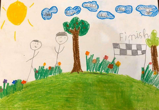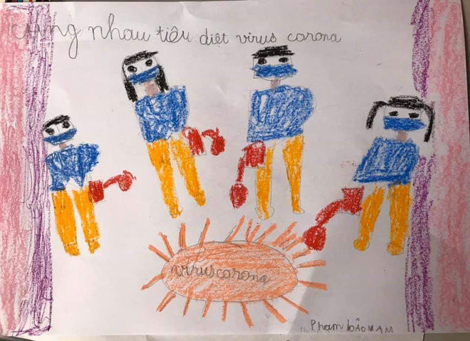 Những món quà tinh thần này là do các em học sinh đến từ lớp 1H, trường Tiểu học Trần Quốc Toản (quận Hoàn Kiếm, Hà Nội) thực hiện. Tuy chưa được hoàn thiện cho lắm, thế nhưng tình yêu thương của các bạn nhỏ nơi thủ đô dường như đã đong đầy và đặt trọn vào trong từng nét bút, mảng màu, tất cả đã tạo thành sức mạnh tinh thần cực lớn gửi đến những người đang nằm trong “tâm dịch”, từ đó có thêm động lực tinh thần để vượt qua quãng thời gian khó khăn hiện tại.