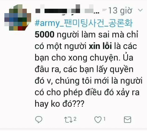 Tuy nhiên, trước, trong và sau khi bạn fan nữ nói trên xin lỗi, nhiều bạn EXO-L vẫn chưa nguôi giận và vẫn đồng loạt trend hashtag #ARMY_팬미팅사건_공론화 trên Twitter (Tạm dịch: A.R.M.Y hãy công khai lên tiếng về sự cố fan-meeting). Thậm chí, các EXO-L còn muốn 5.000 fan đã xem livestream của bạn fan nữ đó phải xin lỗi, bất chấp việc trong số 5.000 fan đó có cả những bạn fan quốc tế xem livestream ở nhà, ở nước ngoài và không phải ai cũng biết tiếng Hàn để hiểu rõ tình hình lúc đó để kịp thời nhắc nhở hoặc can ngăn bạn fan nữ đã cư xử không đúng mực.