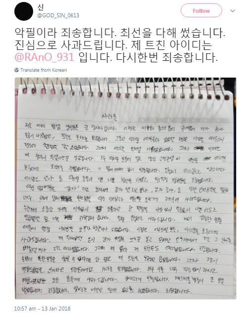 Được biết, bạn fan nữ trong clip sau khi nhận ra mình đã sai đã lập tức xin lỗi, cụ thể là đã 3 lần gửi lời xin lỗi: Lần đầu là ngay trong buổi livestream của cô ấy tại nơi diễn ra fan meeting, lần hai là đăng lời xin lỗi lên Twitter và lần thứ 3, cô bạn đã viết một bức thư tay và đăng lên Twitter.