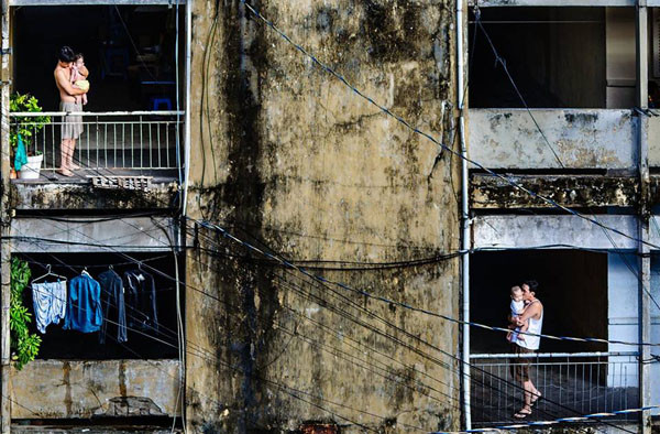 Nhân vật chính trong bức ảnh thuộc về hai người đàn ông đang đứng ở hai ô phòng khác nhau tạo nên sự đối xứng đẹp mắt. Trên tay họ đang bế đứa con của mình có thể là đang cho con ăn hoặc ru con ngủ cũng có thể là đưa con ra hóng gió. Những người đàn ông này ăn mặc tuềnh toàng, người thì cởi trần, người mặc áo ba lỗ, quần đùi, dép lê, thậm chí đi chân đất để ra ngoài hành lang bế con.