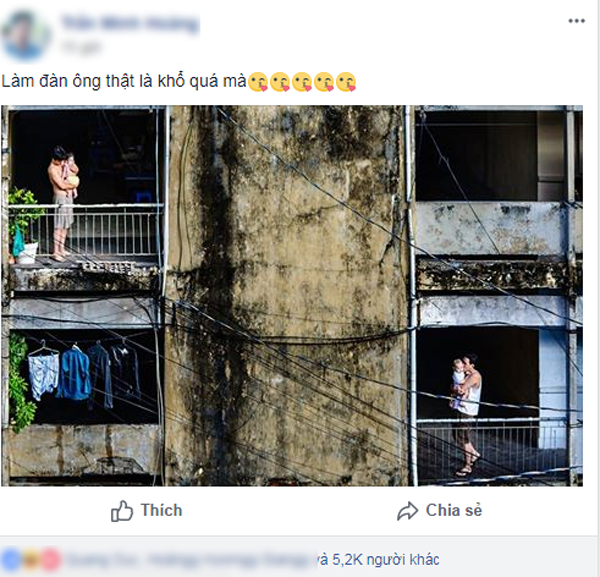 Bức ảnh đơn giản, sơ sài, có chút lôi thôi, luộm thuộm nhưng đã nhận về 5,2 nghìn lượt like, hàng nghìn lượt bình luận, chia sẻ. Đa số các bình luận đều cho rằng làm đàn ông cũng khổ lắm chứ không hề sung sướng chút nào, nhưng hạnh phúc khi được bế con trong vòng tay, song hành cùng con trên chặng đường đời thì không mỹ từ nào diễn tả hết được.