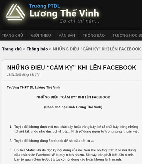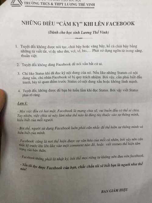 PGS. TS Văn Như Cương, hiệu trưởng của trường THCS & THPT Lương Thế Vinh chia sẻ rằng những điều “cấm kỵ” đưa ra cũng chỉ như một lời khuyên chứ không phải nội quy: “Nhiều học sinh nghĩ rằng Facebook là nơi có thể nói gì thì nói nên đôi khi bất cẩn trong cách biểu lộ cảm xúc và suy nghĩ của mình. Học sinh nên hiểu rằng từ những gì mình đăng tải trên Facebook, người khác có thể biết được trình độ và bản chất của mình nên phải hết sức cẩn thận”.