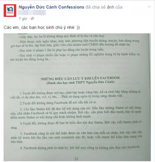 Tiếp sau đó, các trường THPT Nguyễn Đức Cảnh (Thái Bình) cũng đưa ra những điều cần lưu ý khi lên Facebook cho học sinh của trường với những điều tượng tự như trường THCS & THPT Lương Thế Vinh.