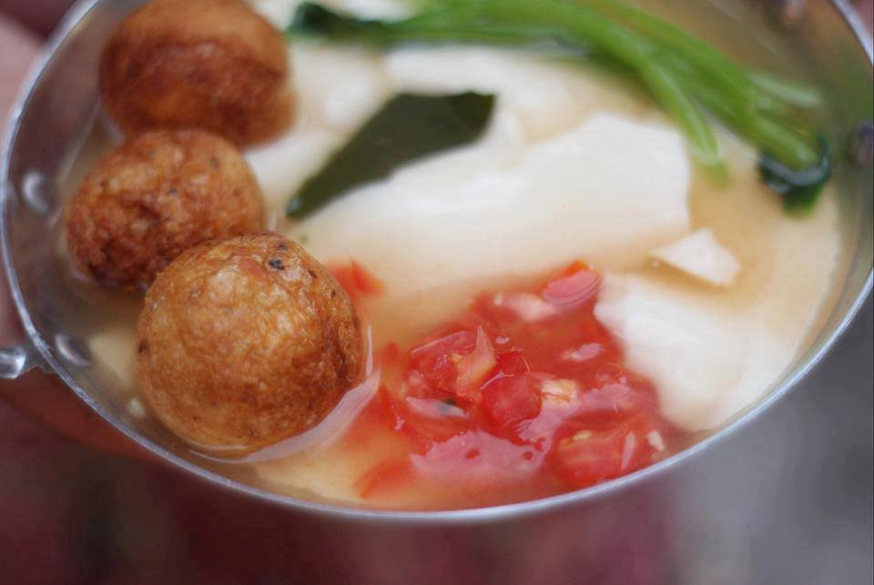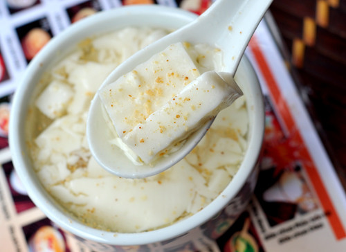 Tào phớ không ăn kèm với các loại đồ ngọt như thông thường mà ăn cùng chả cá, thêm một chút rau cải. Sự hoà quyện khó tin giữa món ngọt và món mặn này nhất định phải thử một lần cho biết thôi.