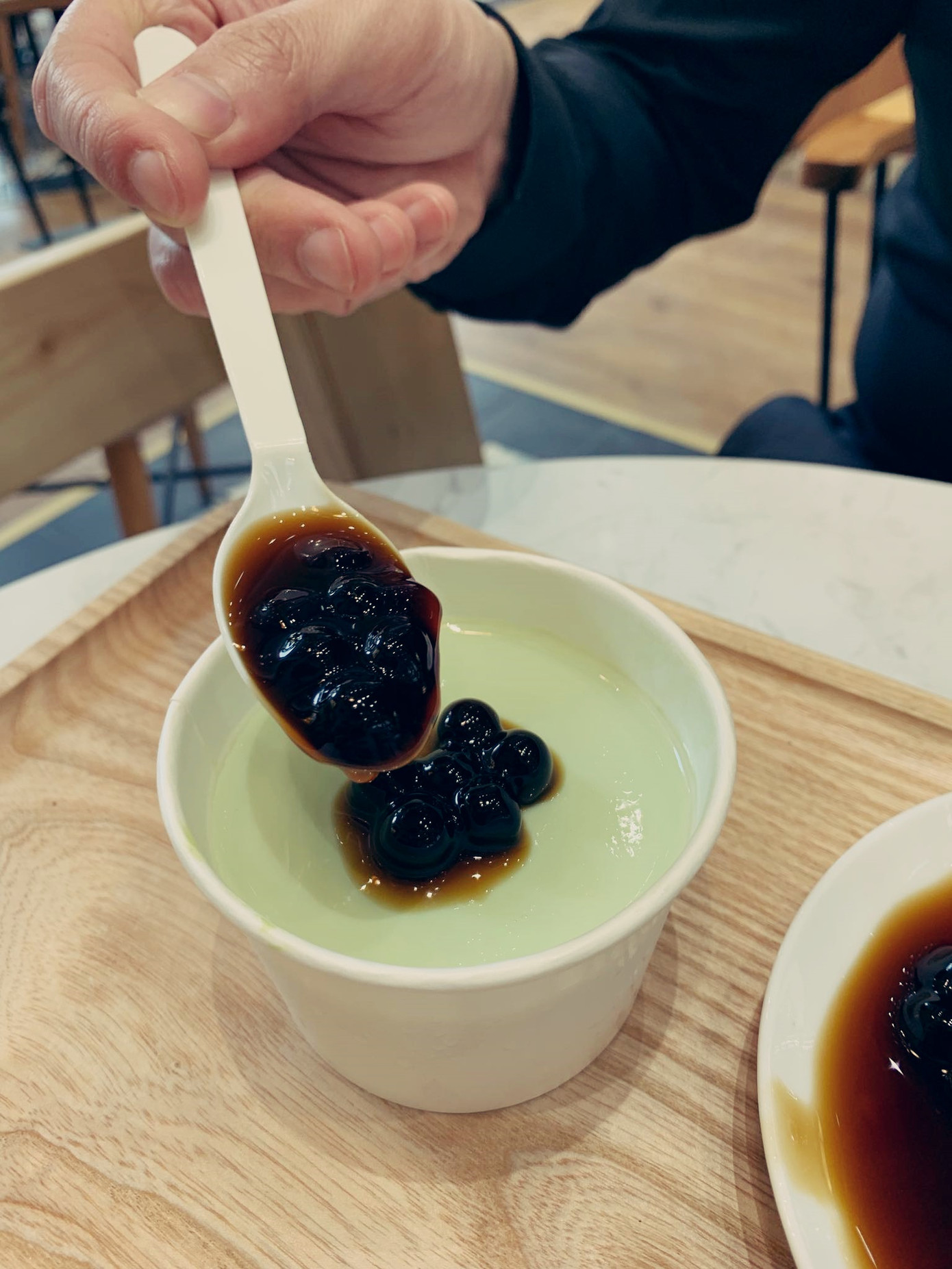 Trân châu đường đen được coi như là topping quốc dân khi có thể kết hợp với rất nhiều món ăn. Tào phớ trong món ăn này hơi khác một chút, là dạng beancurd, tào phớ kiểu đặc như thạch, chứ không mỏng tang được xắt thành lá như tào phớ truyền thống.