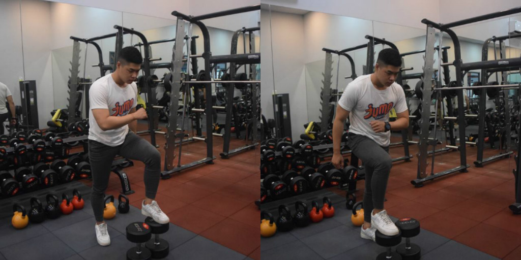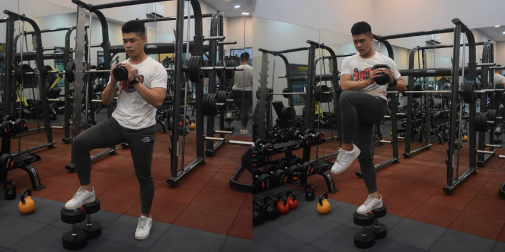 Động tác 1 (stepping up): Một chân đứng trên bục, chân còn lại nâng cao đùi vuông góc kết hợp cầm tạ di chuyển cùng phía. Làm tương tự với chân còn lại.