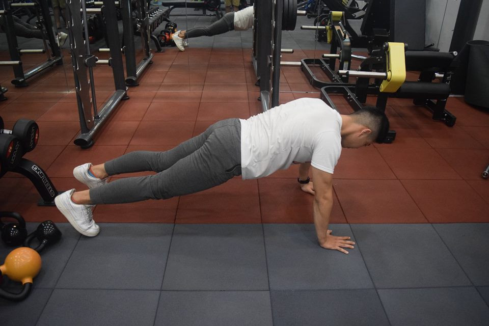 Động tác 3 (push up): Nhịp đầu tiên là hít đất, nhịp kế tiếp giữ cơ thể không chạm đất bằng một tay một chân, giơ thẳng tay và chân còn lại.