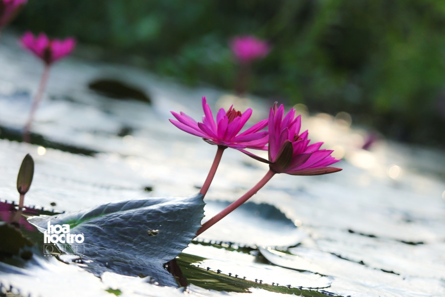 Bình minh lấp ló, hoa súng rực rỡ đón chào ban mai. Hoa súng vươn khỏi mặt nước chừng 10 - 20 cm, lá súng còn non có màu nâu đỏ rồi dần chuyển sang sắc xanh bóng mượt, bồng bềnh trên mặt nước.