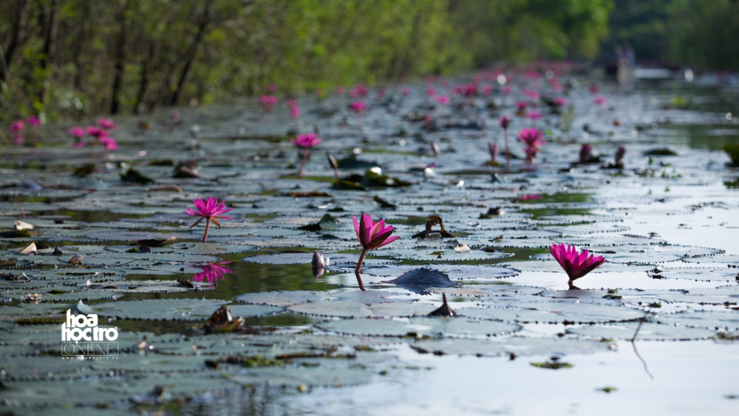 Đến hẹn lại lên, hoa súng nở rộ, sắc hồng đỏ bung ra, căng tràn nhựa sống, vươn mình mạnh mẽ trên mặt nước.