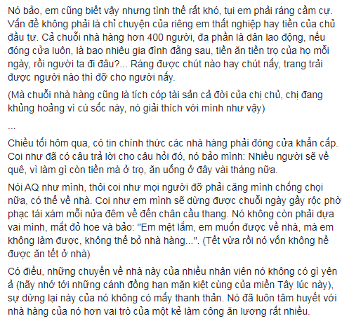 Cụ thể, bài viết chia sẻ: "Mấy hôm trước, gần nửa đêm em mình về tới nhà, nó ngồi gục xuống dưới chân cầu thang: "Tụi em kiệt sức rồi, giờ ở nhà hàng không còn ai cười với khách nữa, trừ em". Nói xong câu đó, nó nhăn mặt và bật khóc. Em mình nằm trong ban quản lý một nhà hàng ở Q.1, cái nhà hàng "gánh team" cho một chuỗi 7 quán. Khách giảm còn 20-30% mùa dịch, mỗi tháng qua, chuỗi nhà hàng bay sạch ít nhất hơn mười mấy tỷ.