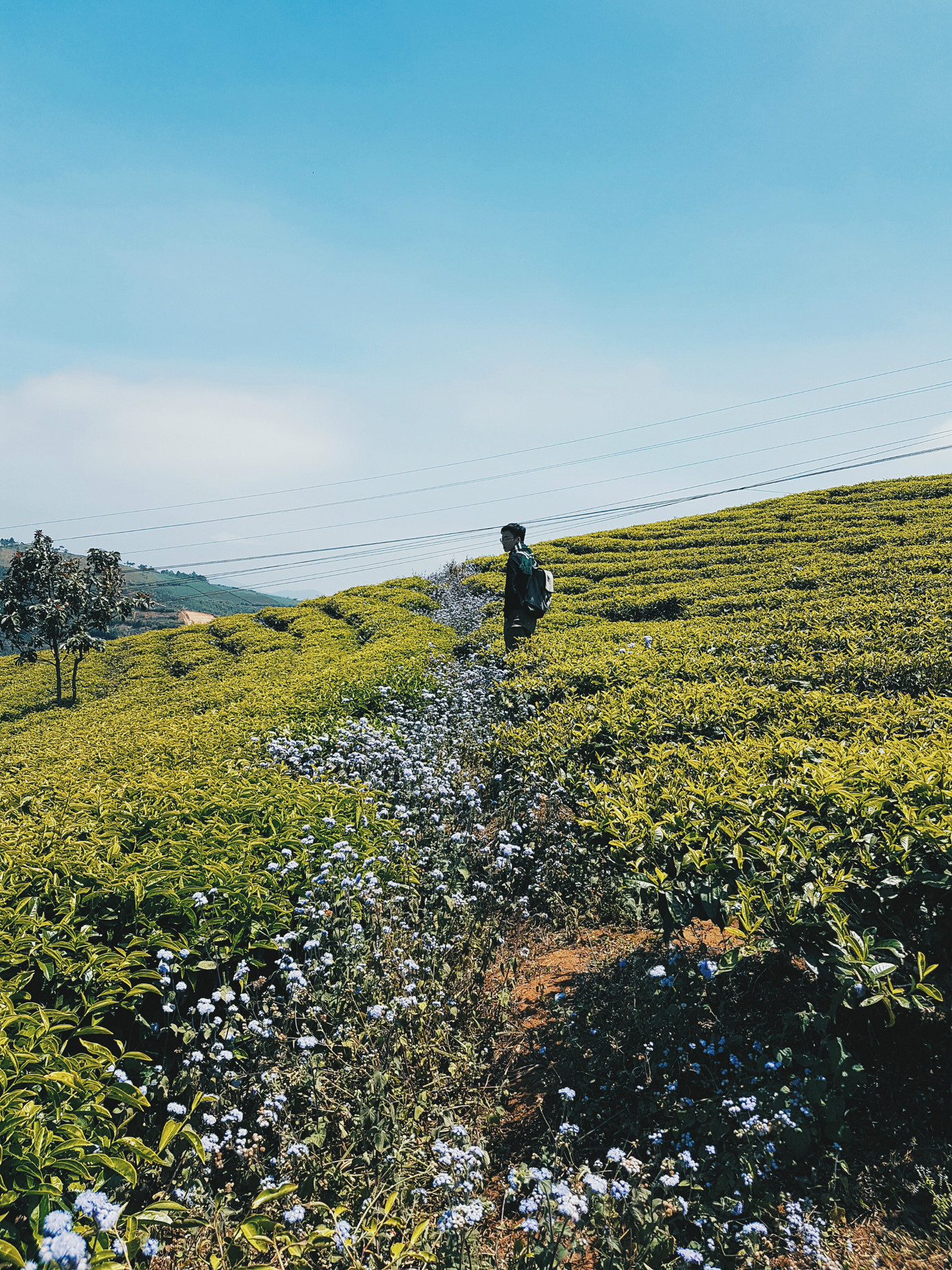Những con đường hoa dại màu tím xen kẽ những luống chè xanh mơn mởn.