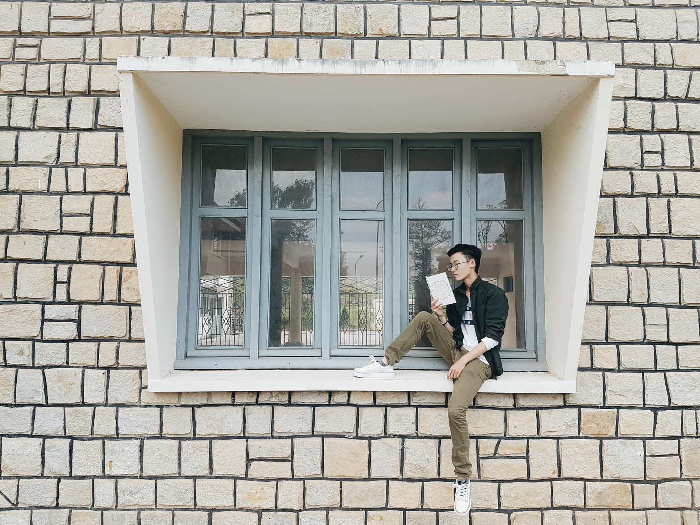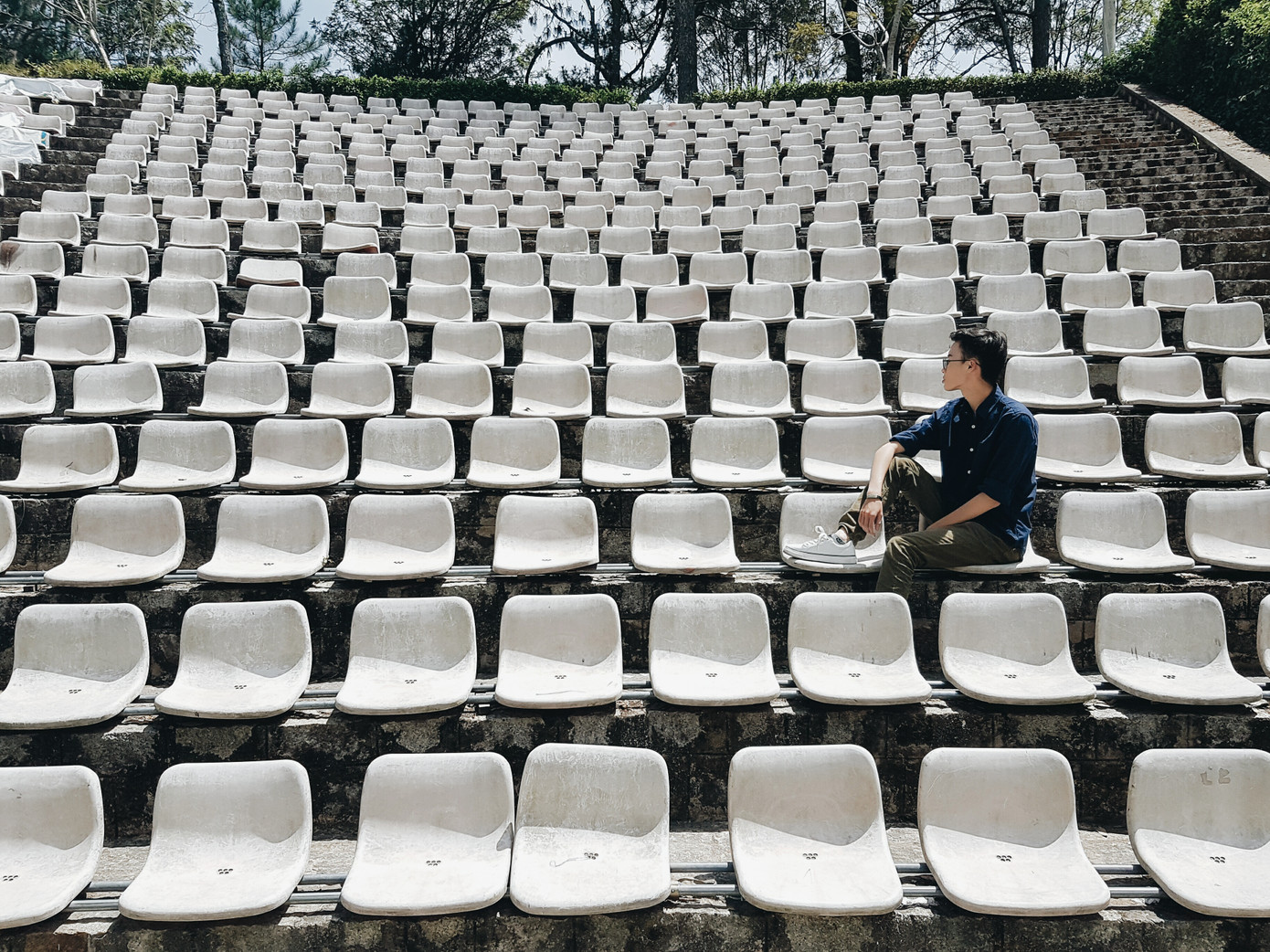 Nơi đây đã quá nổi tiếng về các dãy ghế màu trắng cũ kỹ nhưng lên hình cực "nghệ". Tuy nhiên, có lẽ vì vậy mà mọi người đã bỏ quên khung cảnh phía dưới nhà thiếu nhi. Đi bộ xuống một chút là bạn có thể thấy một tòa nhà những ô gạch cổ kính to nhỏ xếp “hỗn loạn” lên nhau, không gian xung quanh thì vừa rộng rãi vừa mát mẻ không thua gì trường Cao Đẳng Sư Phạm Đà Lạt. Ngoài dãy ghế trắng thì đâu chính là nơi thích hợp để "tác nghiệp" hơn bao giờ hết.