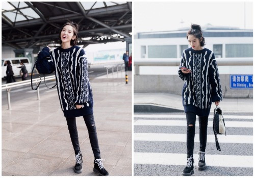 Đường Nghệ Hân có cách mix đơn giản nhất. Cô phối chiếc áo len này cùng quần skinny và sneakers chất liệu da lộn. Kiểu tóc buộc một nửa khiến cô trẻ trung hơn so với tuổi 29.
