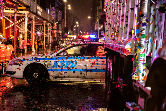 Hoa giấy xuất hiện khắp mọi nơi, bám đầy trên xe cảnh sát sau đêm giao thừa ở Quảng trường Thời đại.