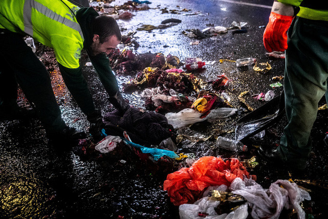 Rác bị bỏ lại sau lễ đón năm mới không chỉ có hoa giấy mà còn có dây ruy băng, mũ lễ hội, đầu lọc thuốc lá, chai nhựa hộp đựng thức ăn và nhiều loại rác khác.