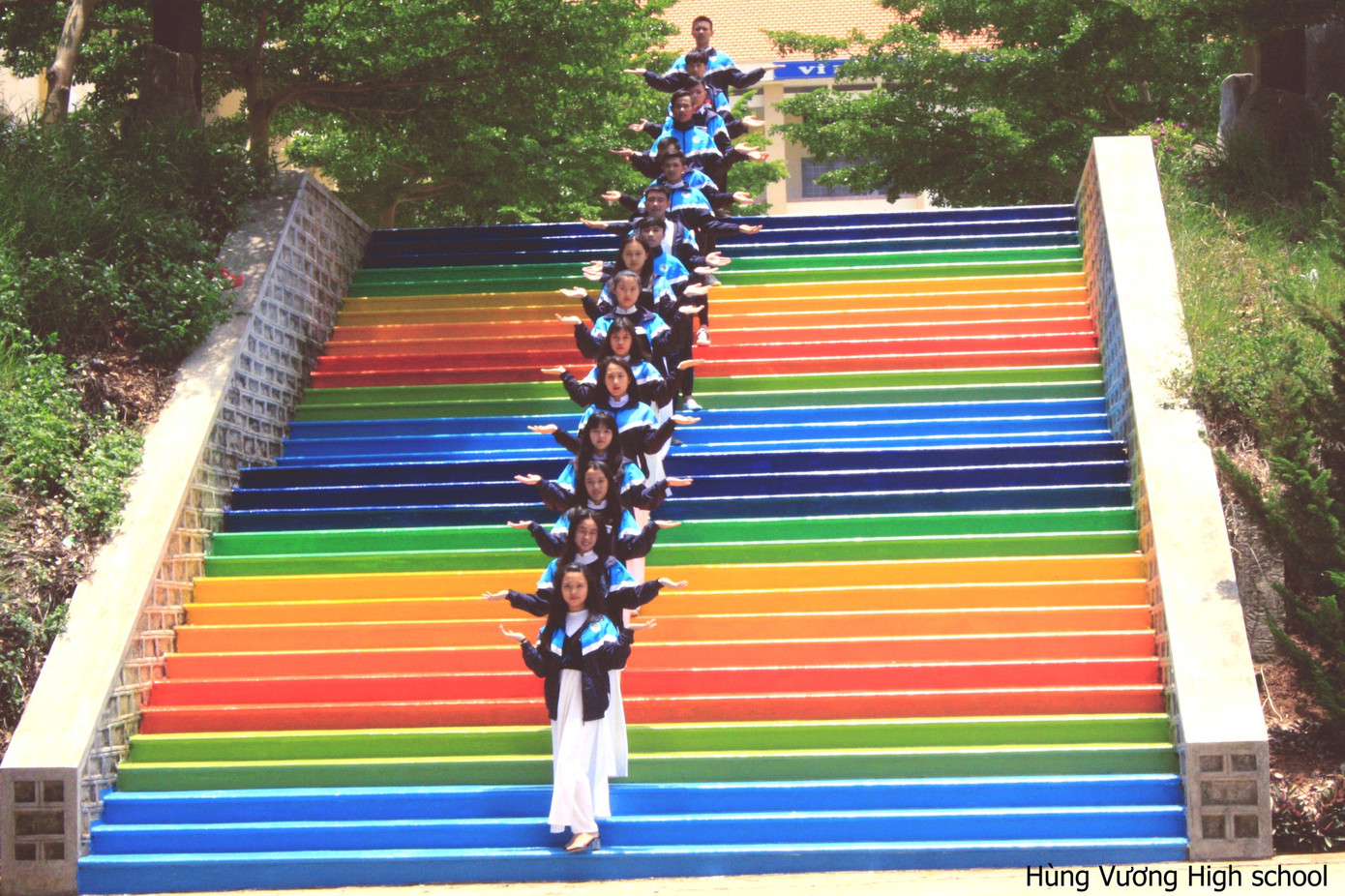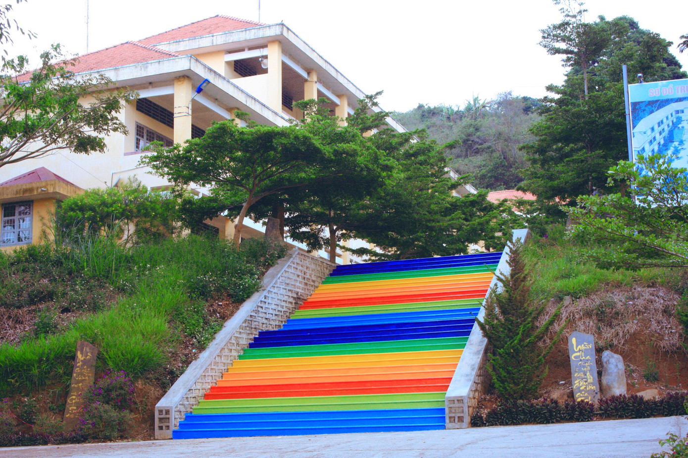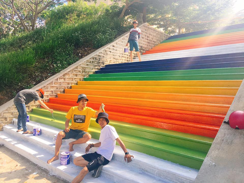 Nhiều ý tưởng hay thường nảy sinh trong những hoàn cảnh đặc biệt. Cũng như câu chuyện tại trường THPT Hùng Vương (Đơn Dương, Lâm Đồng), trong khi tìm ra hình phạt thích hợp cho các bạn học sinh vi phạm nội quy, các thầy cô giáo đã nghĩ ra điều này: Học sinh bị phạt lao động phải hoàn thành nhiệm vụ sơn đủ bảy sắc cầu vồng lên các bậc thang. Và thật bất ngờ, hình phạt thú vị này đã mang lại một góc "sống ảo" tuyệt đẹp!
