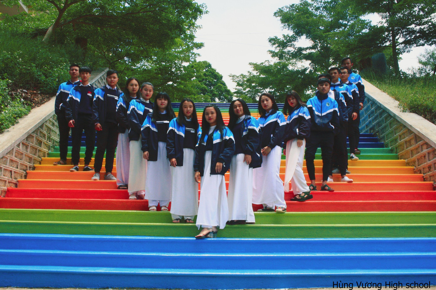 Sau khi hoàn thành, loạt ảnh về chiếc cầu thang cầu vồng này đã được chia sẻ lên rất nhiều nhóm, trang mạng xã hội và nhận được vô số lời khen từ cộng đồng mạng. Nhiều học sinh từ các trường khác cũng thể hiện sự ghen tị với các bạn trường THPT Hùng Vương với "công trình sống ảo" đẹp tuyệt hảo này.