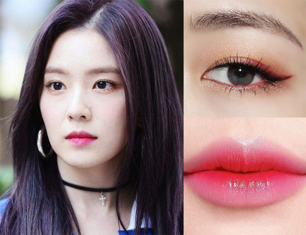 Lối trang điểm quen thuộc của Irene giúp cô nàng trông nữ tính, thanh tao, phù hợp với vẻ đẹp mong manh. Đôi mắt của Irene áp dụng cách đánh màu khói, dùng nhũ cam hồng tán đều khóe mắt, đuôi mắt phủ tông nâu đậm và một chút phấn hồng. Đôi môi của người đẹp được đánh son theo kiểu ombre, có sự chuyển màu rõ rệt từ hồng sang đỏ để tăng độ ngọt ngào.